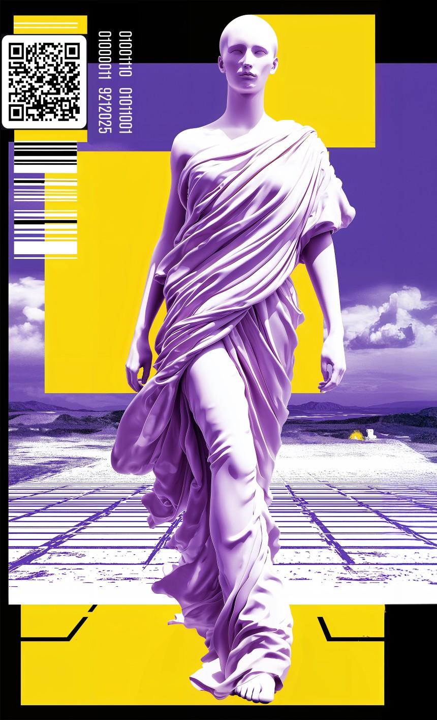 The juxtaposition of the monochromatic figure against the vivid celestial bodies creates a striking visual metaphor for humanity's enduring...